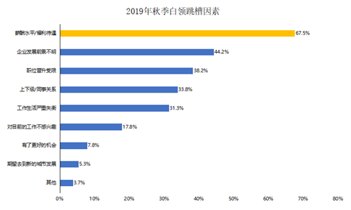 白领们总说,“今年是我找工作最难的一年”,那么今年到底难不难?2019年秋季跳槽意愿调研显示,52.7%的白领认为今年跳槽难度高于往年,57.3%白领有实际跳槽行动,较去年同期的52%有所提升。而薪酬水平、福利待遇成为大多数白领跳槽的动力。