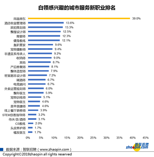 调研显示,56.2%白领表示随着城市服务行业蓬勃发展,将考虑加入其中。白领最感兴趣的三个城市服务新职位分别为民宿房东、酒店收益管理师与旅拍策划师,均为旅行相关职位,在白领心中,诗和远方总是抹不去的印记,符合当下白领追求自我、体验生活的内心期望。