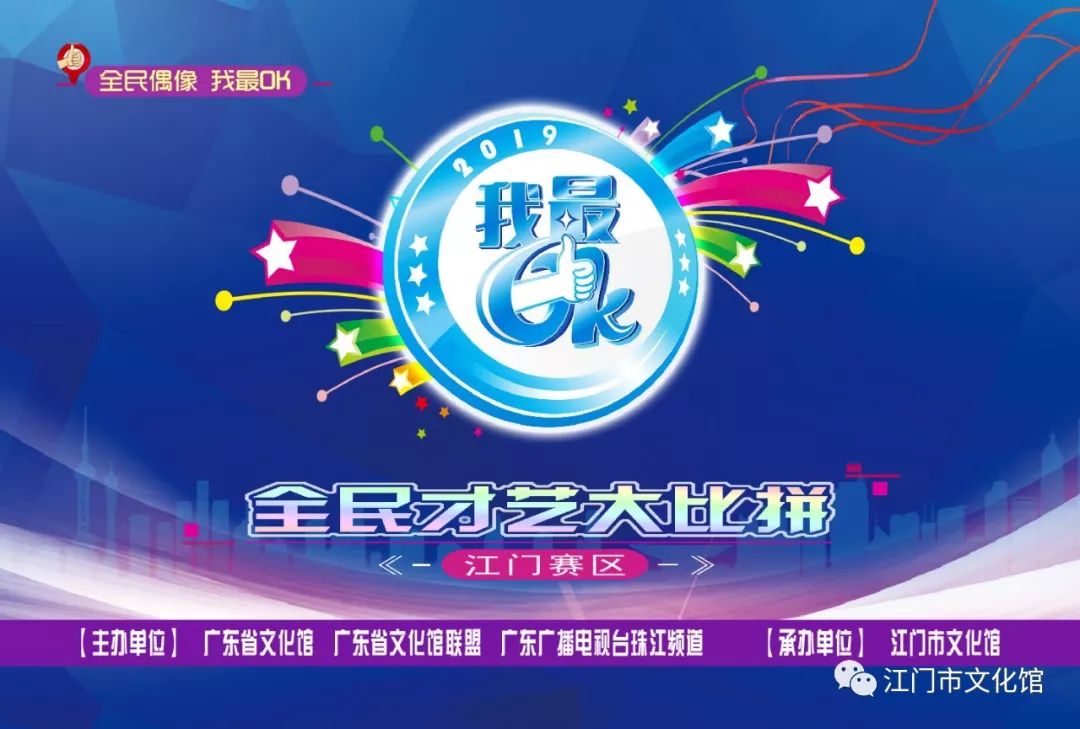 2019“我最OK”广东全民才艺大比拼由广东省文化馆、广东省文化馆联盟、广东广播电视台综艺频道联合主办,由江门市文化馆承办。活动自启动以来,受到了广大群众的热烈响应,参赛者上到老人、下到孩童,来自各行各业,展示了丰富多样的技能才艺,从不同角度歌颂党的光辉历程,赞扬人民美好生活,抒发时代奋进精神,激发了广大群众的文化热情和活力,进一步推动江门市群众性文化活动蓬勃发展。