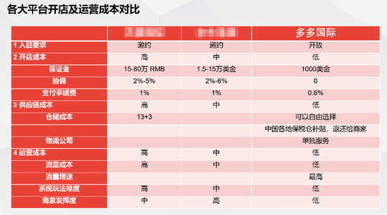 ▲各大跨境平台的对比信息显示,拼多多全球购具有明显的成本优势