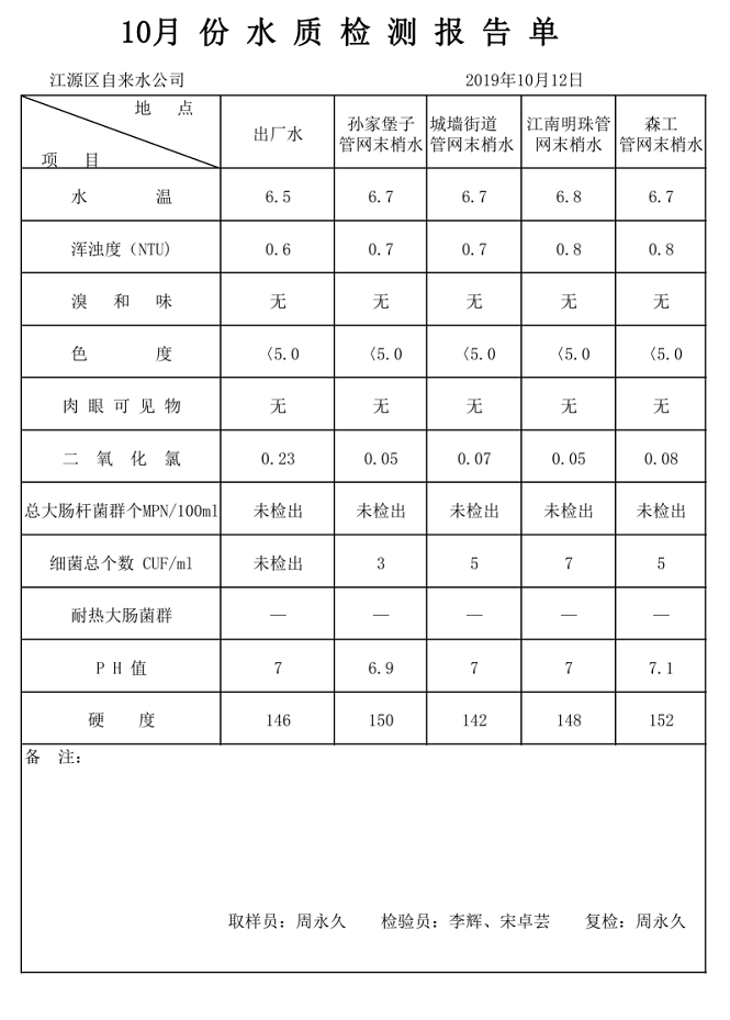10月份水质检测报告单