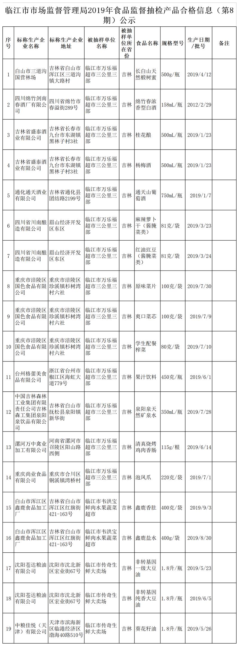临江市市场监督管理局关于食品监督抽检信息的公示(2019年第8期)