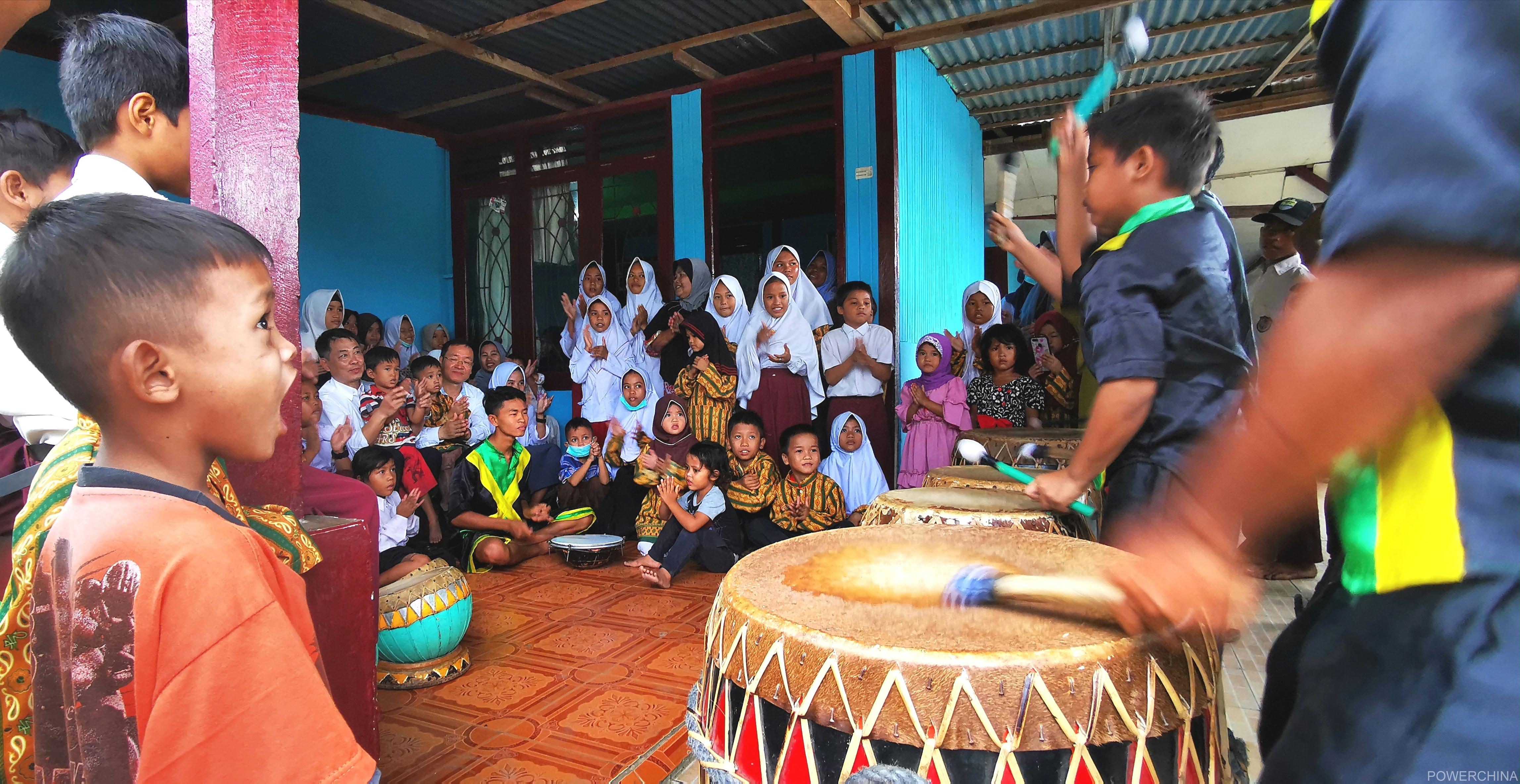 “欢乐的锣鼓敲起来!”赵勇一挥手,当地锣鼓表演队就摆开架势,热热闹闹敲起来。孩子们围成一团,合着密集的鼓点,欢快地打起了节拍。为给孩子们更多快乐,发电公司这次前来专门聘请了印尼传统大鼓表演。