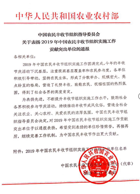 由农业农村部牵头组织成立的中国农民丰收节组织指导委员会,对拼多多、中国银联等2019年丰收节期间贡献突出单位予以表彰
