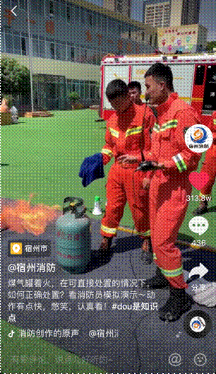 比如@宿州消防 发布的一条抖音视频中,宿州市的消防战士从专业角度亲身演示了如何处理着火的煤气罐。这条视频获得了超过6200万次播放和超过310万次点赞,充分证明广大用户对于视频所演示的处理方法非常感兴趣。