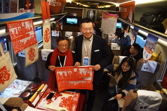 11月24日,乘客在体验列车上与泰安剪纸手工艺人(左)及其作品合影。