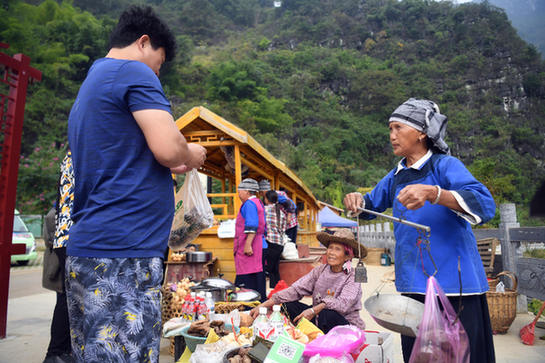 2015年凌云县借助浩坤湖山水自然风光优势,以“景区+村集体+农户”共建模式,引导帮扶贫困群众参与发展民宿旅游等特色产业,多渠道促增收。今年1月至10月,浩坤湖景区接待游客近50万人次,实现旅游综合消费1.42亿元,浩坤村现在已经有152户709人脱贫,贫困发生率降至13.11%。