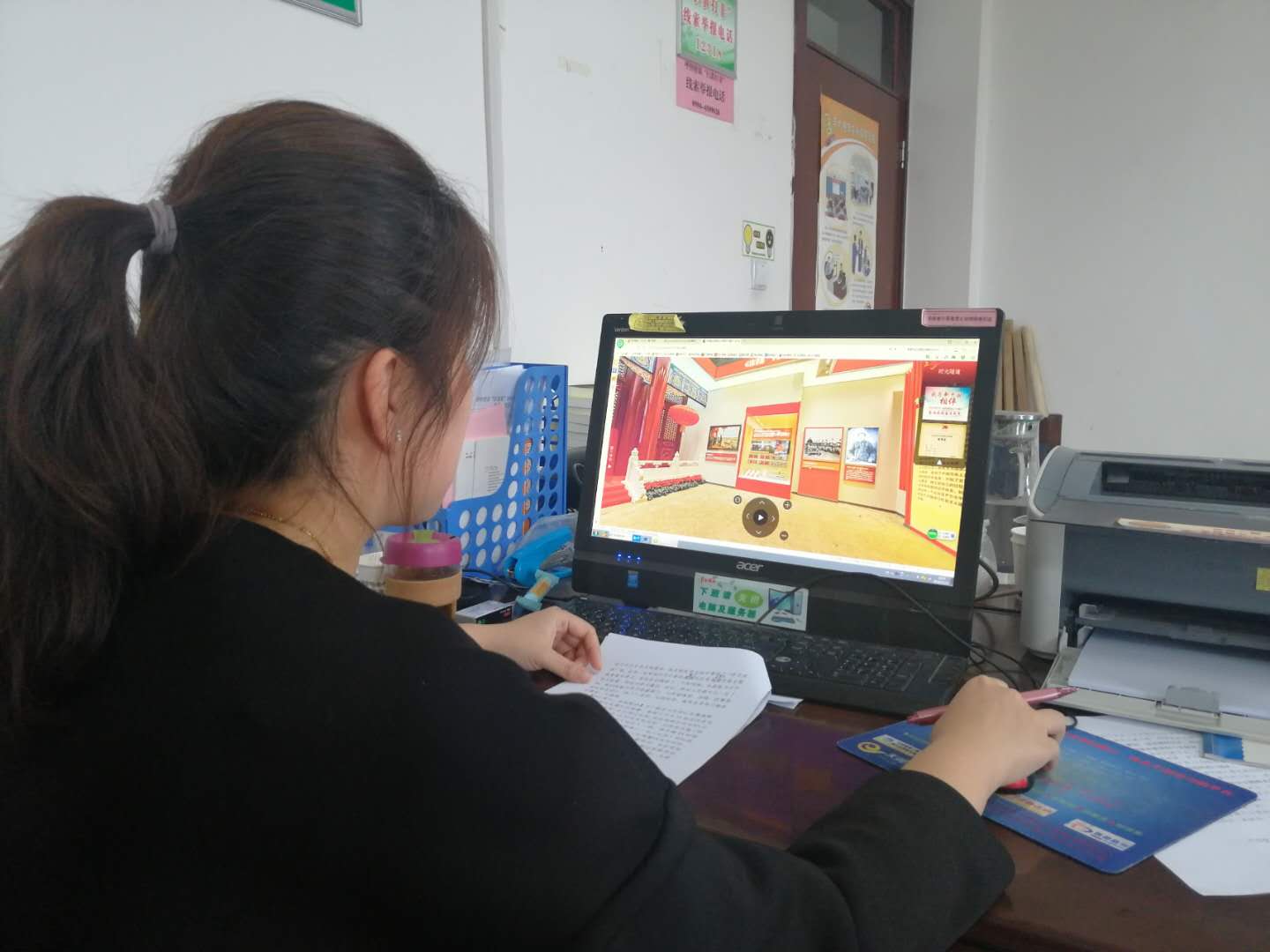 在县“不忘初心、牢记使命”领导小组办公室,工作人员正在观看“伟大历程辉煌成就——庆祝中华人民共和国成立70周年大型成就展”网上展馆。网上展馆分为“序厅、屹立东方、改革开放、走向复兴、人间正道”五大部分,以编年体式形式,通过网络平台全要素生动地呈现出新中国成立70年来,在中国共产党的坚强领导下,中华民族迎来了从站起来、富起来到强起来的伟大飞跃。