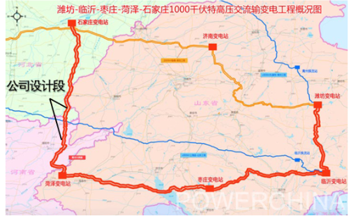 潍坊-临沂-枣庄-菏泽-石家庄1000千伏特高压交流工程线路工程,全线双回路架设,路径长度2×816km,途径山东、河南、河北三省,也称山东-河北环网工程,公司设计标段横跨河南河北两省,线路长度75公里,杆塔148基。