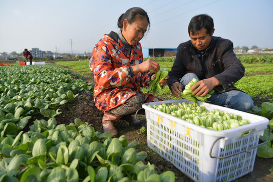 12月2日,在江西省萍乡市上栗县赤山镇大院村,当地农户在蔬菜种植扶贫基地内将采摘的上海青装筐准备外销。