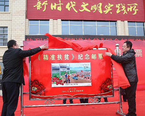 11月29日,嘉宾在《精准扶贫》纪念邮票发行仪式上揭幕。新华社记者 贾浩成 摄