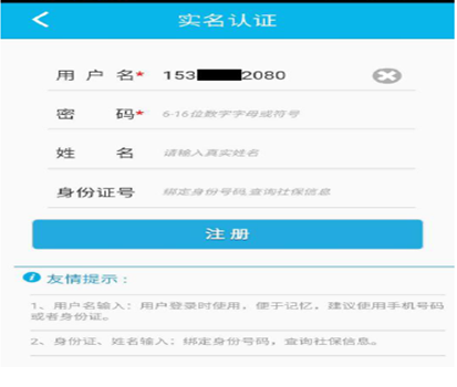 3)输入密码、姓名、身份证号,点击【注册】,完成新用户注册。