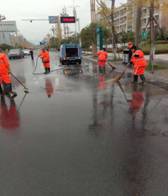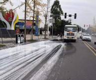 ? ? ? ?岷江环卫作业人员第一时间到达现场查看情况,并出动洒水水车1台、路面养护车1台、调派环卫作业人员10多名组成临时突击应急队,立即展开处理污染作业。因乳胶漆污染面积较大,液体的流动性大,污染处理难度大,公司出动洒水车进行三次冲洗洗刷工作完成了路面的清洁,使路面恢复干净整洁。