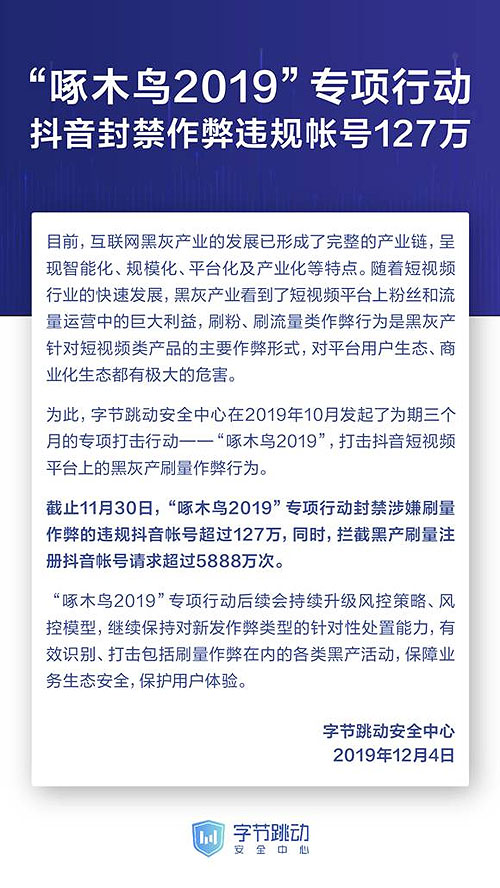 抖音开展“啄木鸟2019”行动打击黑产,封禁作弊帐号超127万