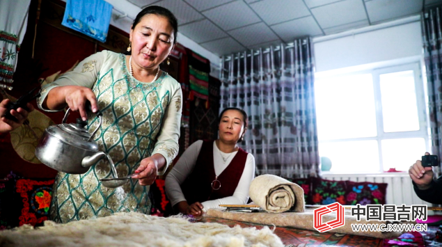 玛依努尔说,花毡的制作流程说起来简单,做起来却很费力气。完成一张精美的花毡,至少要五六个人一起花费两天的时间。制作花毡最主要的材料是羊毛。玛依努尔和同伴把羊毛撕成蓬松的絮状,均匀地铺在席子上,浇上开水,再把席子卷起来,有节奏地用力来回拉扯绑在席子上的绳子。约莫半小时之后,毛毡就制成了。随后,经过冲洗、上色、晾晒,一张彩色的毛毡就初步成型。