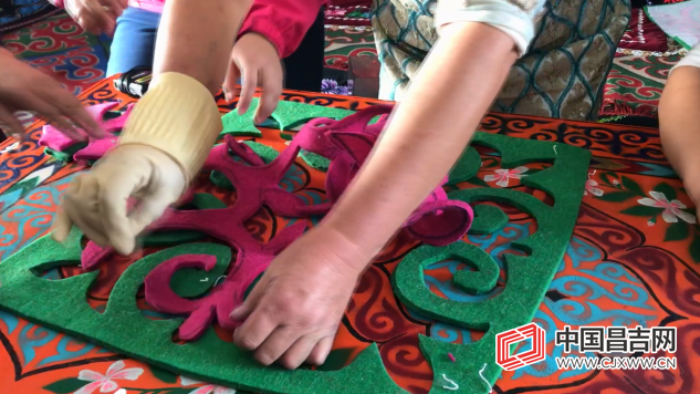 花毡上绘制的羊角图案,灵感来自于哈萨克族游牧生活中的“好搭档”——羊。图案绘制好后,玛依努尔把两张不同颜色的毛毡叠在一起,顺着图案开始裁剪。由于两张毡叠起来有十几毫米的厚度,裁剪时比较费力。长期从事花毡制作的玛依努尔已经有了足够的经验,因此,她裁剪出的图案线条平整,将其拼接在另外一张镂空的毛毡上时严丝合缝。毛毡嵌好后,心灵手巧的玛依努尔用独特又巧妙的针法,把两块拼接起来的毛毡缝合在另一张底毡上,一张牢固耐用、美观大方的花毡就制作完成了。