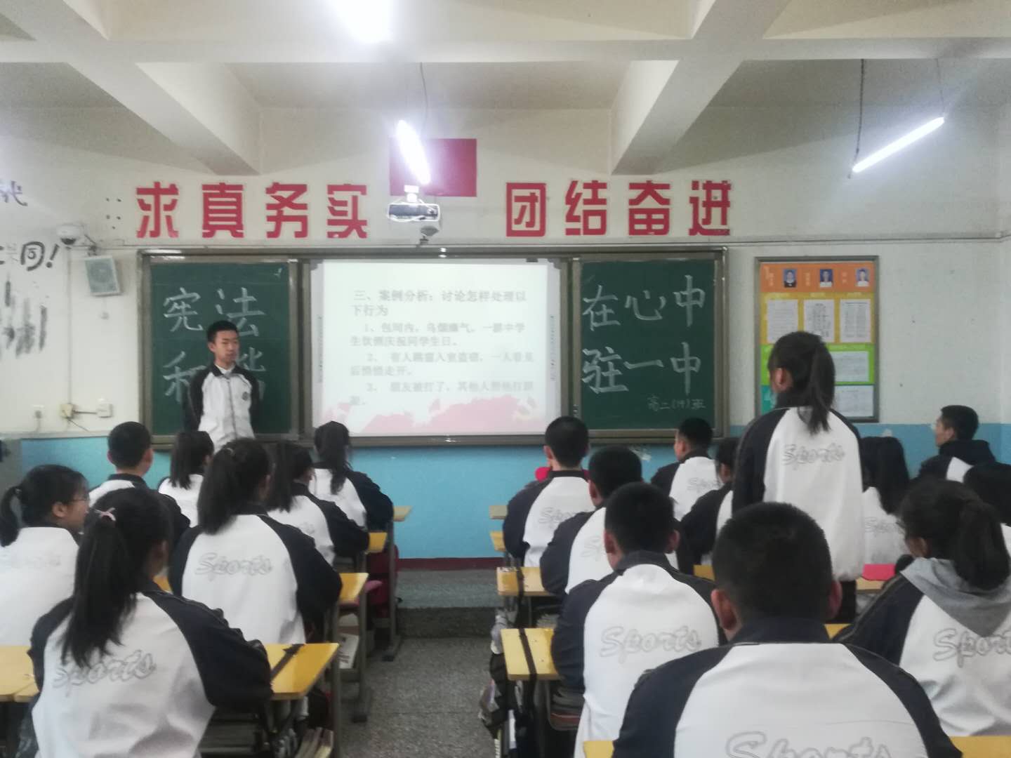 县一中高二年级开展了“宪法在我心中”主题班会活动,集体学习了宪法的产生与发展、宪法的构成、宪法的主要内容等知识,随后进行知识竞赛,全面检验学习成果,选取几个案例引导学生一起分析如何做一名遵纪守法的学生,学生们还表演了小品《宪法协奏曲》,倡导全体学生牢固树立法治意识,知法懂法,在日常学习和生活中积极践行宪法精神,真正让宪法体现在我们的一言一行之中。