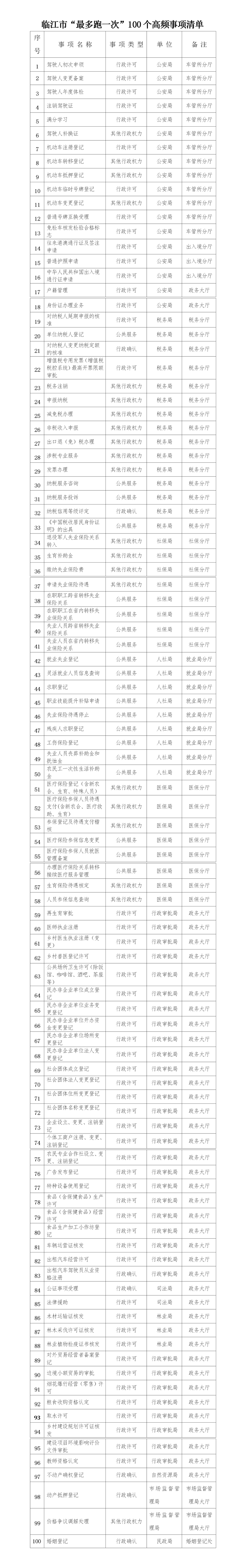 临江市政数局关于公布临江市 “最多跑一次” 100个高频事项清单