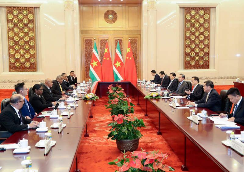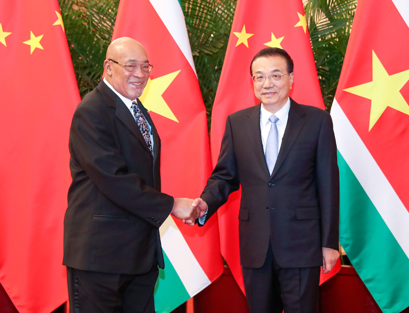 李克强表示,中国和苏里南虽然相隔万里,但两国人民之间友好情谊深厚。建交40多年来,双边关系始终健康稳定发展。习近平主席将同总统先生举行会谈,推动中苏关系迈上新台阶。我们愿继续在相互尊重、平等相待的基础上,同苏方增进政治互信,对接发展战略,促进务实合作,扩大人文交流,更好实现互利共赢。