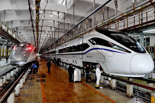 12月19日,福州动车段地勤机械师在检查动车组列车。