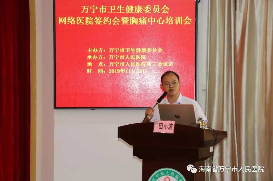 本次会议由万宁市人民医院医务科田小波主任主持。田小波主任对市卫健委卢传毅副主任、文昌市人民医院专家团队、万宁市各医疗机构院长及所有参会人员的到来表示热烈的欢迎。希望通过此次网络医院签约及举办的胸痛中心培训,可以为今后万宁市胸痛中心建设提供坚实的基础。