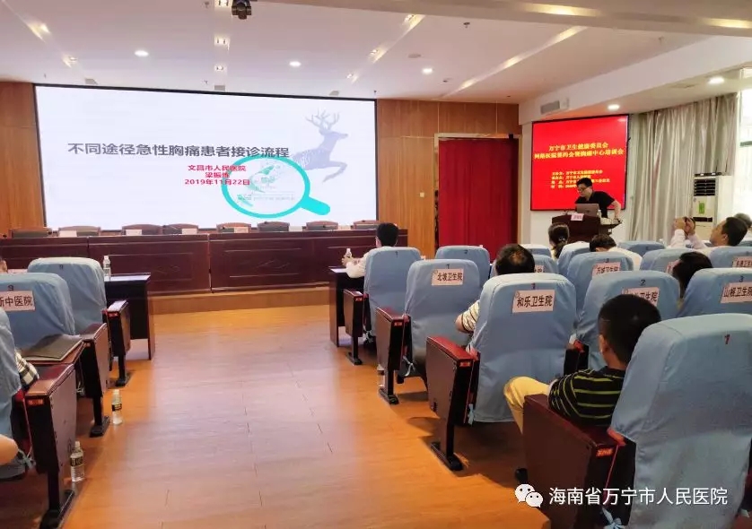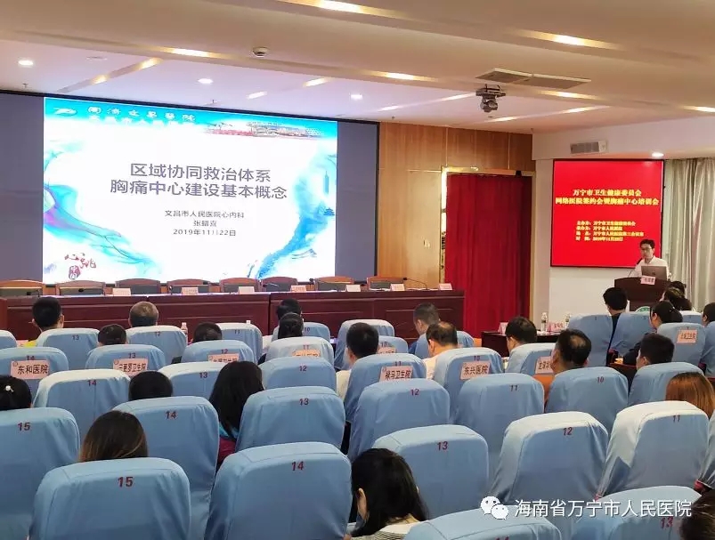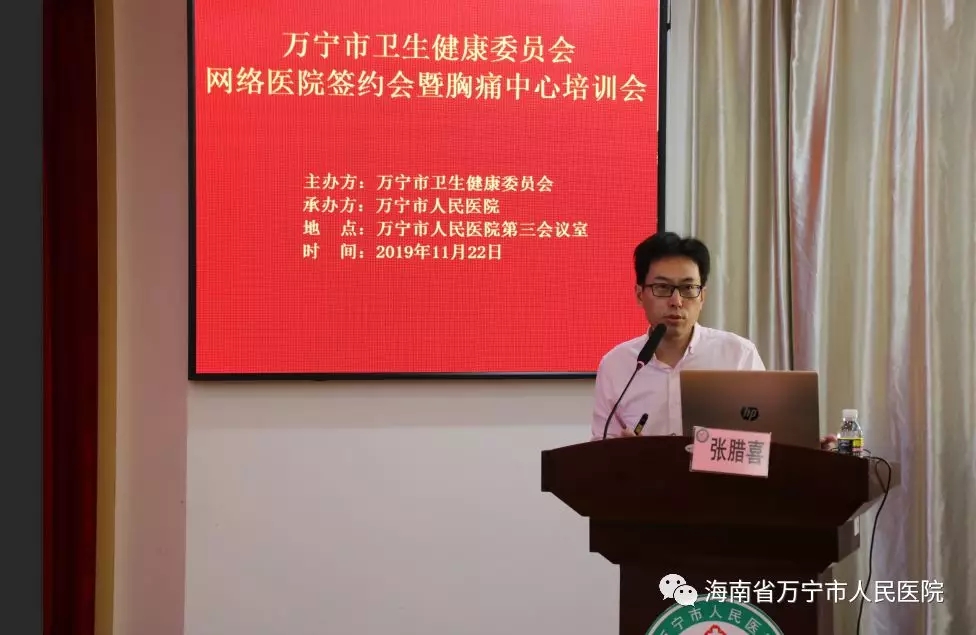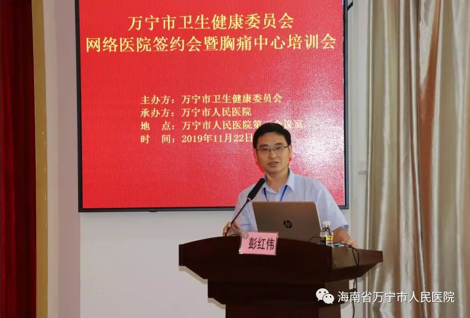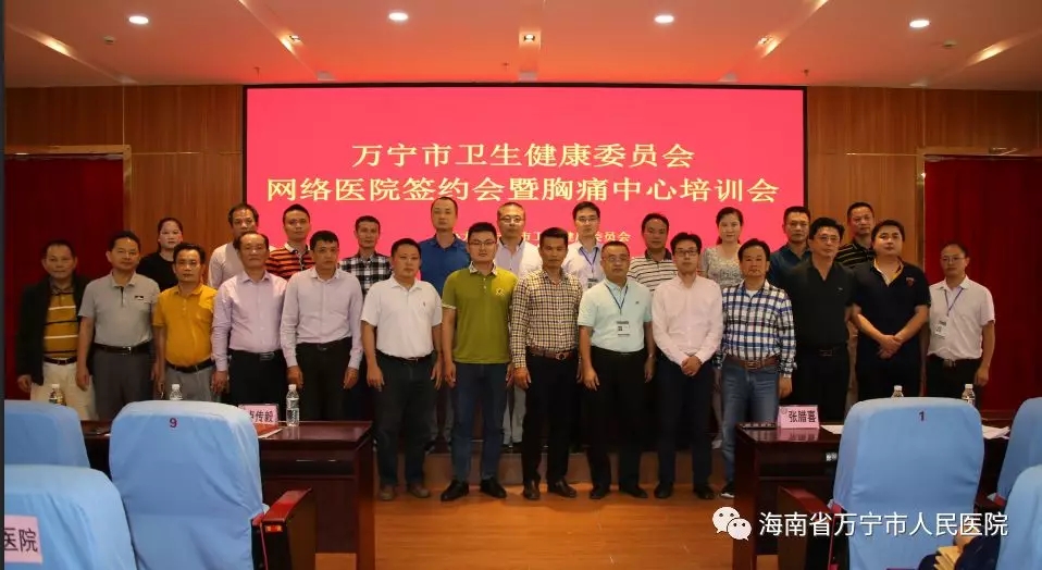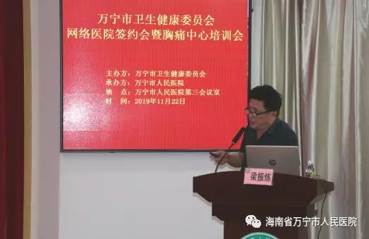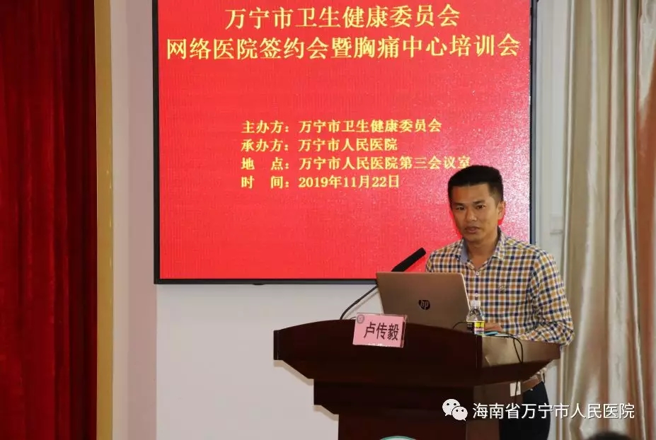 为提高我市各医疗机构对胸痛患者的诊治能力,有效预防和控制心血管相关疾病,进一步推进我市胸痛中心建设,万宁市卫生健康委员会定于2019年11月22日在万宁市人民医院举办了“网络医院签约会”暨“胸痛中心培训会”。万宁市卫生健康委员会副主任卢传毅,万宁市人民医院党委书记、院长陈吴荣、万宁市人民医院副院长范平云以及23家万宁市基层卫生院院长及全市有关胸痛中心建设的骨干参加本次大会。