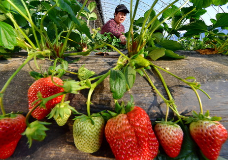 12月23日,滦州市东安各庄镇东孟家屯村农民在大棚内管理草莓。