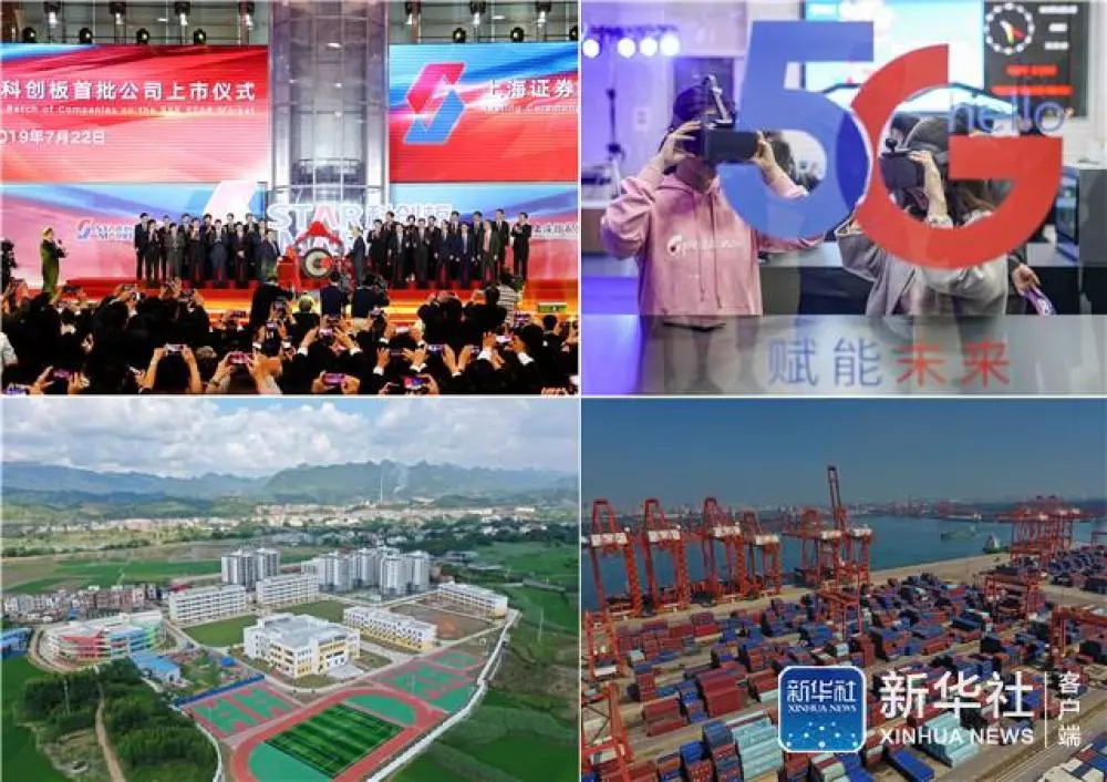 ?↑拼版照片:左上为7月22日拍摄的上海证券交易所举行的科创板首批公司上市仪式现场(新华社记者 方喆 摄);右上为10月31日,中国移动、中国电信、中国联通正式发布各自的5G套餐,消费者在中国电信北京公司朝阳门营业厅体验5G云VR视频(新华社记者 沈伯韩 摄);左下为8月28日拍摄的位于广西田东县思林镇的一处易地扶贫搬迁安置点(无人机照片,新华社记者 曹祎铭 摄);右下为8月15日拍摄的河北唐山港京唐港区集装箱码头(无人机照片,新华社记者 杨世尧 摄)。新华社发