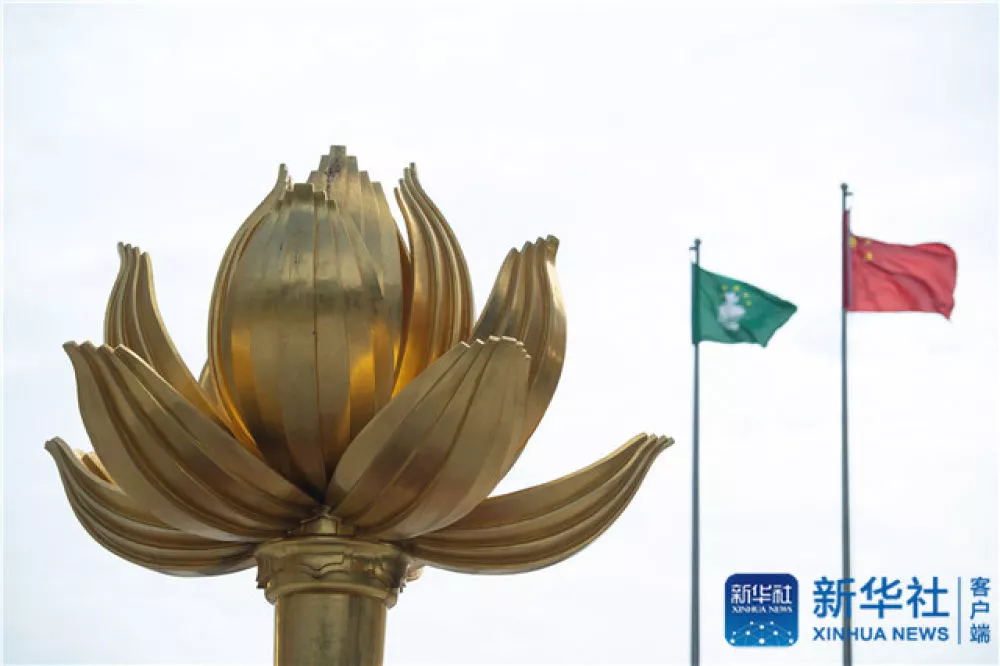 ?↑这是12月13日拍摄的澳门金莲花广场上的《盛世莲花》雕塑。新华社记者 张金加 摄