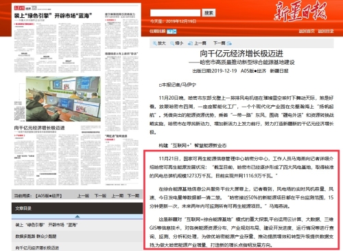 12月19日,《新疆日报》刊发题为《向千亿元经济增长极迈进——哈密市高质量推动新型综合能源基地建设》的专题报道,高度肯定了由水电水利规划设计总院投资建设运营的哈密综合能源基地信息公共服务平台(以下简称“哈密平台”)建设运营成果,社会反响热烈。文章指出,“哈密平台是新疆对‘互联网+综合能源基地’模式的重大探索,平台运用云计算、大数据、三维GIS等信息技术,对各类能源资源分布、产业规划布局、建设开发进度、运行情况等进行查询、监测、分析和处理,为做优哈密能源产业存量、推动提质增效和转型升级提供数据支持,为做大哈密能源产业增量、打造新的增长点指明发展方向”。