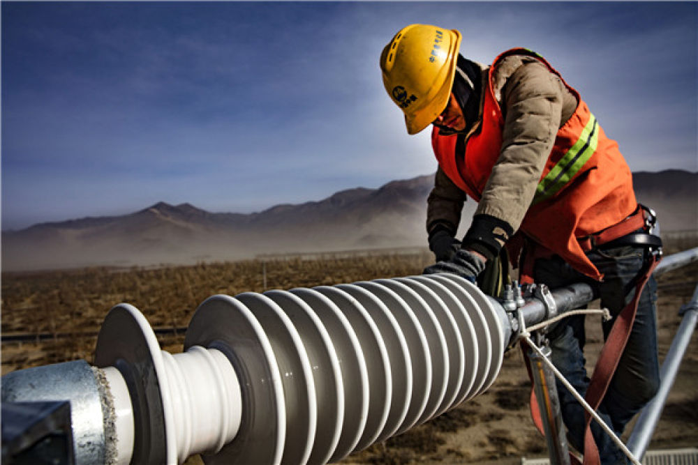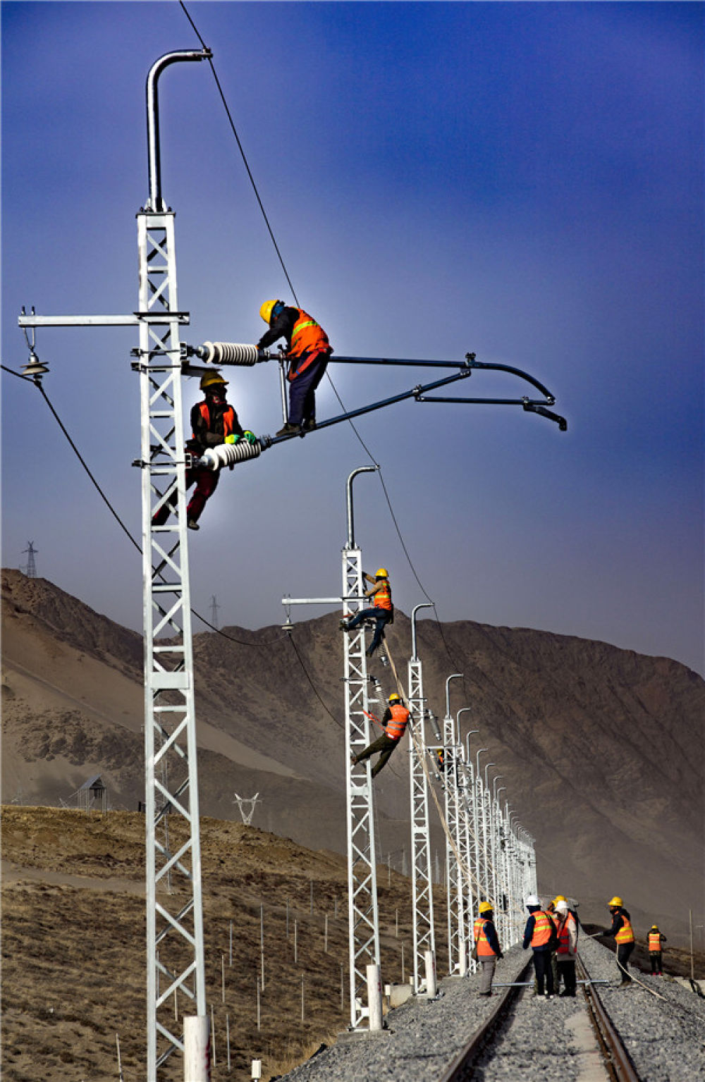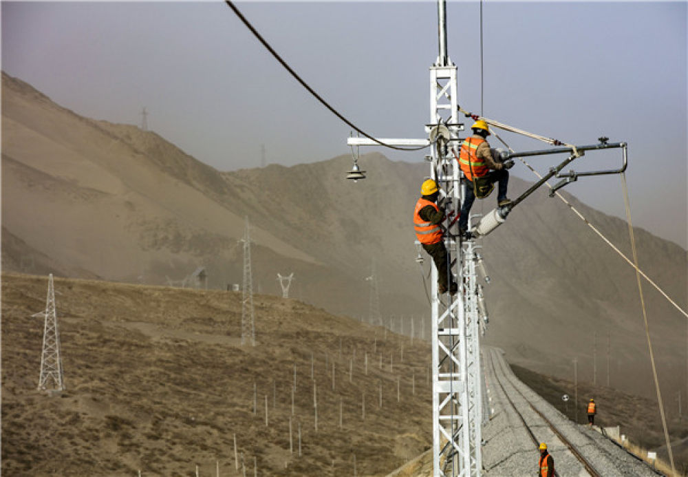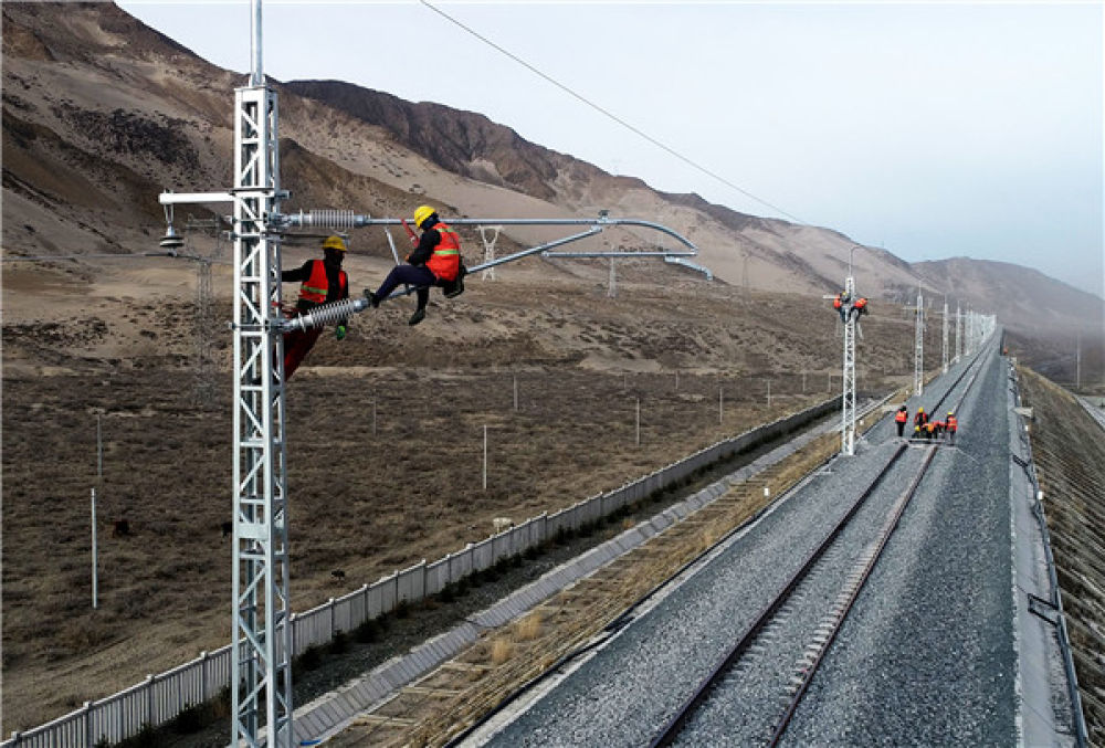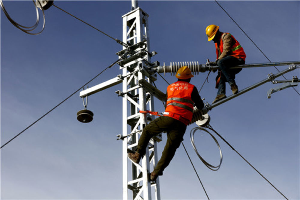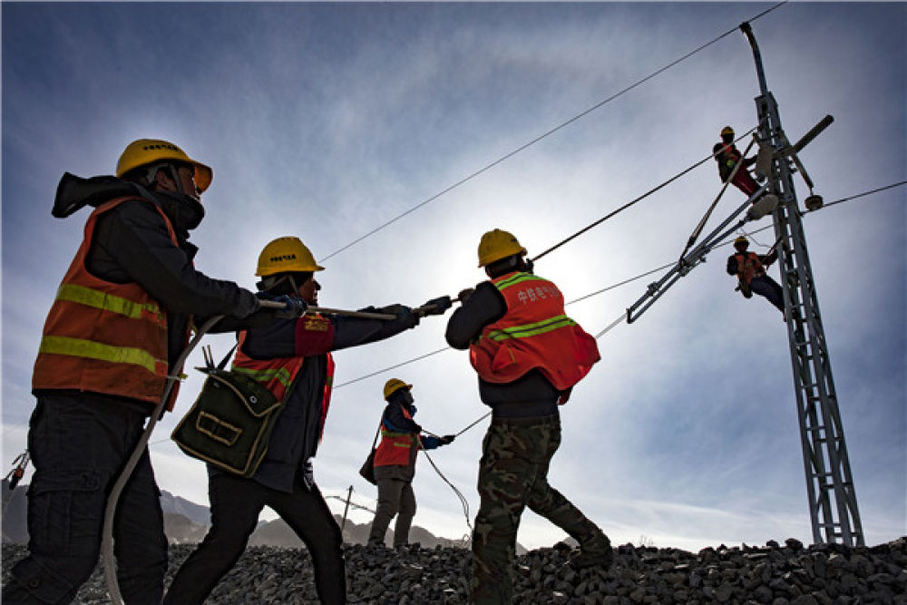 2020年1月1日,在西藏自治区山南市,中铁电气化局集团西安电化公司施工人员正在扎其站至泽当站区间进行电气化施工。焦宏涛 摄