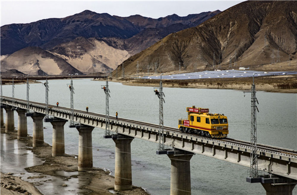 2020年1月1日,在西藏自治区山南市,中铁电气化局集团西安电化公司施工人员正在雅鲁藏布江明泽特大桥上进行电气化施工。焦宏涛 摄
