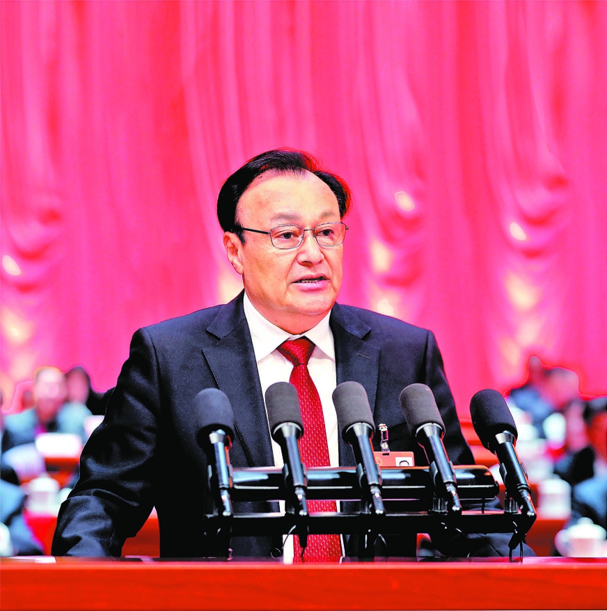 1月6日,雪克来提·扎克尔在自治区十三届人大三次会议上作政府工作报告。记者崔志坚 摄