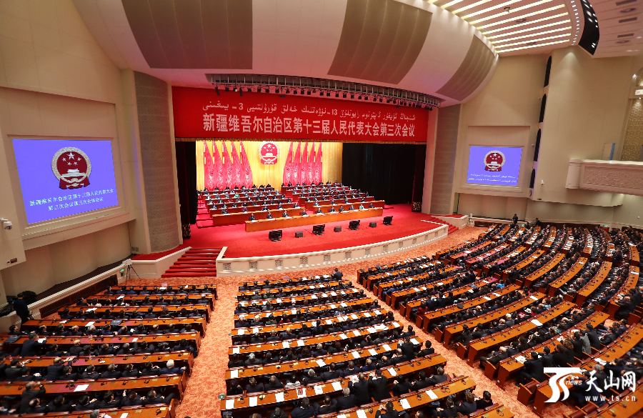 1月10日,自治区十三届人大三次会议在新疆人民会堂闭幕。图为会议现场。