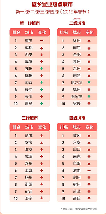 58安居客房产研究院首席分析师张波认为,返乡置业是近年持续热门的话题,同时由于品牌房企在三四线及以下城市布局的下沉化,拉动更多春节期间返乡人群关注当地楼市。从返乡人群的变化来看,用户不但会关注地县级城市的项目,同时还会关注到本省更为核心的二三线城市。加之落户政策放松,二三线城市春节期间的找房热度有望创出新高。