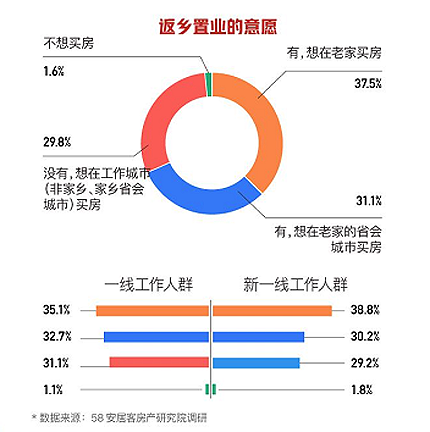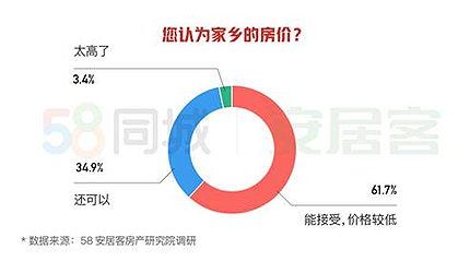 58同城、安居客调研显示,在外打拼的人群中,有61.7%的人表示家乡的房价能够接受,回乡买房的压力会更小些。
