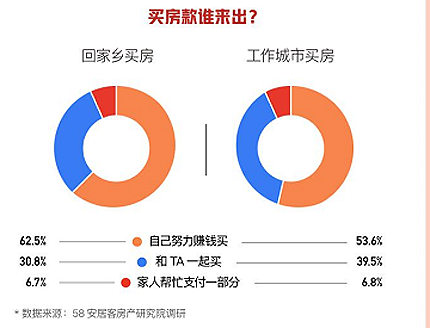 58安居客房产研究院指出,对于回家置业的人群来说,家乡的房产价格相比较低,买房的压力也更小。关于买房款由谁来解决,调研显示,多数人选择了靠自己的努力来买房,意向回家乡买房的人群中选择“自己努力赚钱买”的占比62.5%。