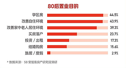 数据显示,在返乡置业的人群中,80后(80-84年)返乡置业的意愿最强烈,倾向回乡置业(包含家乡城市及家乡所在的省会城市)的人群占比74.0%;置业目的方面,80后对于学区房最为关注,高于改善自住的选项;改善老人居住环境也是购房的重要原因之一,返乡置业的首要原因是“离家近,方便照顾家人”。