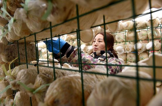 1月14日,任县马庄村农民在设施温棚内采摘白灵菇。