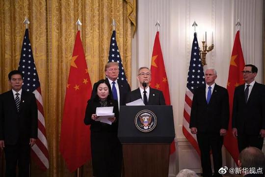 当地时间1月15日上午,中美第一阶段经贸协议签署仪式在美国白宫东厅举行。中共中央政治局委员、国务院副总理、中美全面经济对话中方牵头人刘鹤与美国总统特朗普共同签署协议文本并致辞。