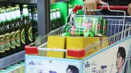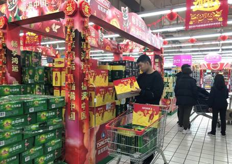 “青岛啤酒作为知名的酒水品牌,像经典1903、纯生、奥古特、鸿运当头等基本上都不需要多做介绍,顾客就非常熟悉了。尤其春节期间,鸿运当头、奥古特等中高端产品格外受青睐,有些顾客来到以后,提起来就往购物车里放”,商超工作人员高先生介绍。