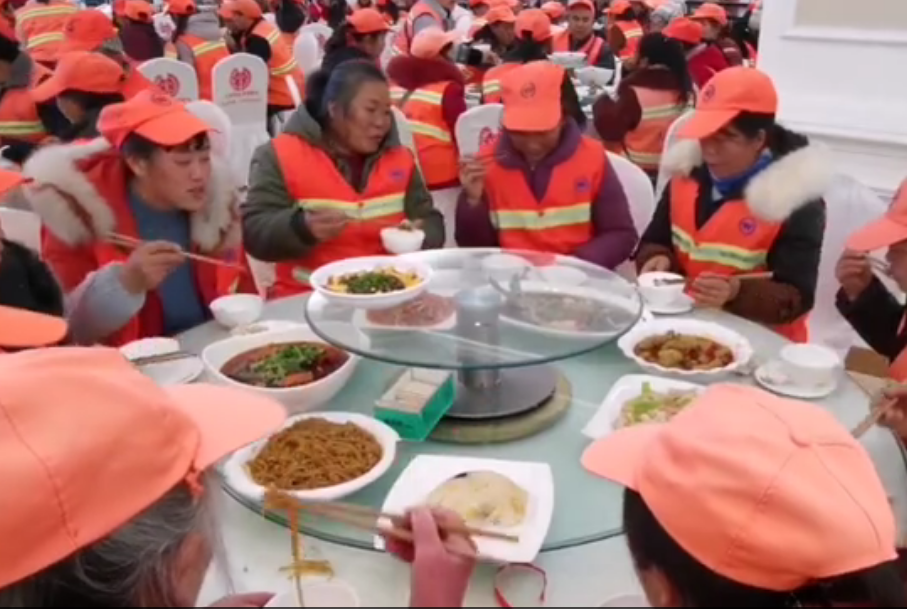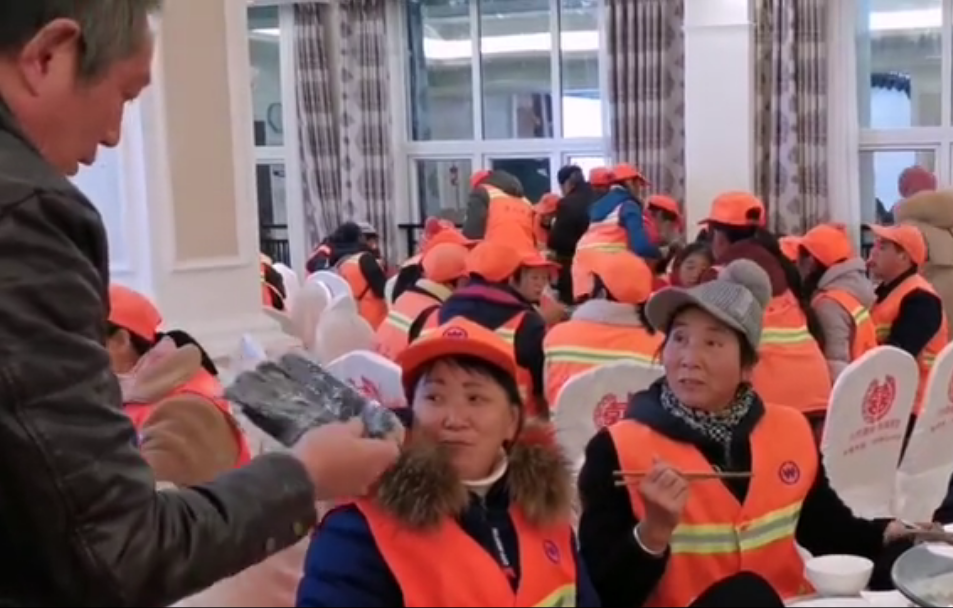 他们是沐川县住建局下属事业单位环境卫生管理所的300余名环卫工人。据悉,这位刘先生已连续三年为沐川环卫工人置办年夜饭,也连续三年在饭席间为他们送上温暖的手套、耳挂等物品。