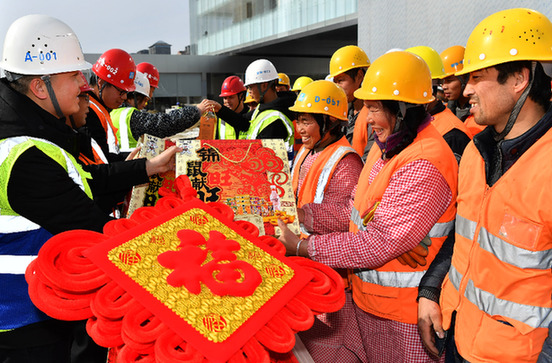 1月19日,中建三局西安一项目工地的工作人员为工友们送上返乡礼包。