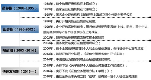 我国现代征信行业从20世纪80年代后期起步,遵循“政府主导、市场为辅”的模式发展。自1988年首个征信评级机构在上海成立,历经30余年,发展至今大致可划分为萌芽期、起步期、规范期、快速发展期四个阶段。
