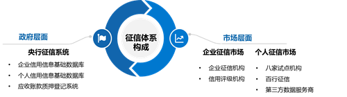 目前中国的征信体系由“政府+市场”双轮驱动。政府层面主要指人民银行的征信中心负责的国家信用信息基础数据库,即央行征信系统;市场层面包括企业征信市场和个人征信市场。