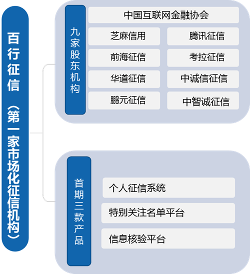 百行征信注册资本为10亿元,主要股东为中国互联网金融协会,持股36%,芝麻信用、腾讯征信、深圳前海征信中心、鹏元征信、中诚信征信、考拉征信、中智诚征信以及北京华道征信8家首批个人征信试点机构各持股8%。