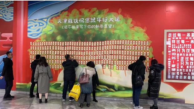 2020年春节来临之际,为充分践行天津轨道交通“快捷无忧,贴心一路”的服务宗旨,提升广大乘客的乘车体验,1月18日,津轨商业公司联手运营集团在天津站交通枢纽、西站交通枢纽先后推出“春节拜年”主题公益广告,该广告以“天津轨道交通集团携天津轨道交通运营集团及津轨商业公司向全市人民拜年”为主旨内容,以喜庆的“红色”为主背景,画面设计采用具有代表性的2020庚子鼠年卡通形象,并配以归途的暖心文案,使广大乘客感受到天津轨道交通的人文关怀。同时,配合“击鼓祈福”、“许愿树”等互动形式,增强乘客的参与感,尤其是“许愿树”通过乘客留下的文字,将2020年的美好愿望传递下去。