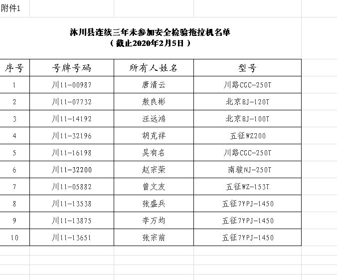 附:1.沐川县连续三年未参加安全检验拖拉机名单(截止2020年2月5日)