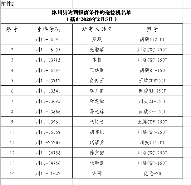 2.沐川县达到报废条件的拖拉机名单(截止2020年2月5日)