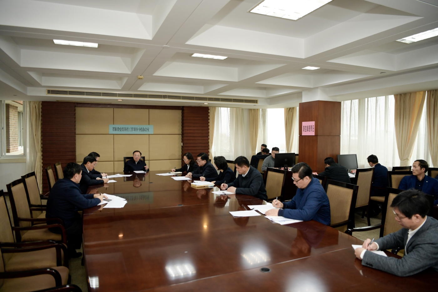 在防控工作领导小组办公室,醒目地挂着“疫情就是命令、防控就是责任”的标语。吴政隆与应对协调组、综合服务组、值班信息组、督查落实组等工作人员交流。他指出,疫情防控正处于关键期,必须坚决贯彻习近平总书记重要指示要求,把疫情防控这项当前最重要工作抓紧抓好。领导小组办公室要充分发挥职能作用,做好信息报送、统筹协调、督查督办等工作,眼睛亮、见事早、行动快,有力有效推动党中央、国务院和省委、省政府的部署要求落实到各级各部门,落实到重点领域重点场所,落实到基层神经末梢,落实到每一个环节和责任人,以大家的辛苦指数换群众的安全健康指数。
